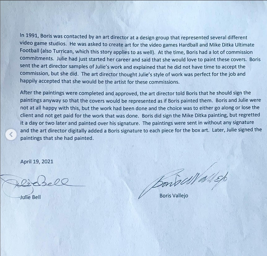 - Mike Ditka Ultimate Football (Accolade/Ballistic | Genesis | 1991) box signed by Boris but later credited to Julie Bell