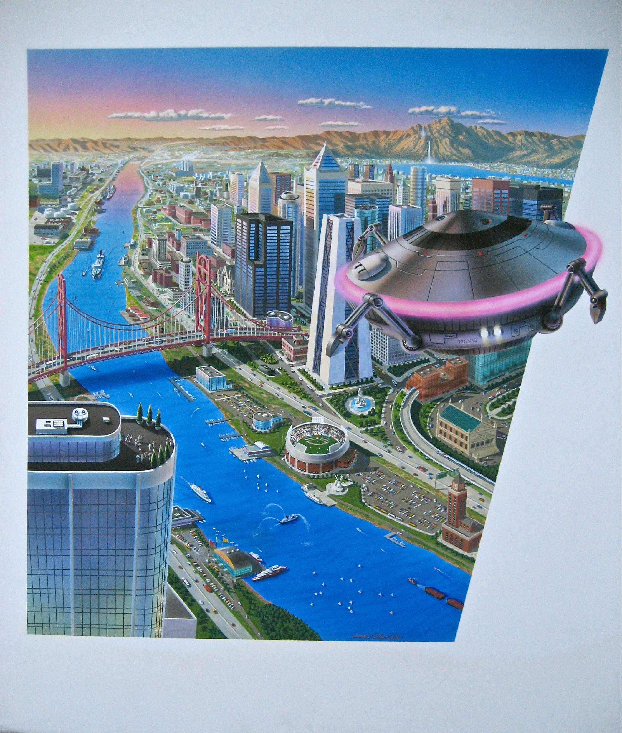 Years before his SimCity work, David created the Transformers battle scene that appeared on the back of every boxed Transformer package in 1984 and on numerous other licensed Transformers products—everything from lunch boxes to puzzles to pack-in catalogs, sleeping bags, underwear, and everything in between. The original 30” x 20” Transformers painting was advertised for sale in the July 4, 1997 issue of Toy Shop magazine. In a 2013 interview, David said he “sold the original for cheap 20 years ago before Transformers really took off to a comic book collector.”