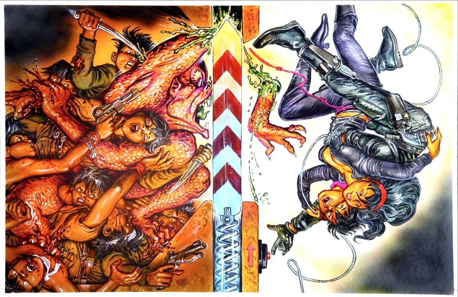 Another repurposed artwork would be The Demon's Forge (1987), which originally appeared on the cover of Zzap #13 (1986) and under the title Cauldron & Antiriad. It is one of a handful of Oli's box art paintings that the U.S. arm of Mastertronic used exclusively in the United States. Oli's art promoted the rerelease, with the original 1981 game sporting a very different cover by artist Vicente Segrelles.